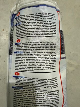 Fundas antideslizantes para nieve, su bolsa está desgastada pero las fundas están sin usar, no se han puesto nunca. Validas para varias medidas de neumático, desde 15" hasta 18" (se pueden ver en la etiqueta en una de las fotos)