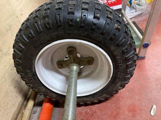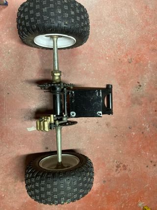 Eje trasero completo para quad SMC. Incluye ruedas, frenos y transmisión. - Ruedas con llantas blancas. - Sistema de frenos. - Cadena de transmisión.