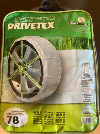 Cadenas textiles para la nieve de la marca DRIVETEX, talla 72. Incluyen instrucciones y consejos de montaje en DVD. - No producen vibraciones durante la conducción. - Incluye 1 par de cadenas, 1 bolsa para guardarlas y 1 par de guantes. - Recomendadas por la DGT para desplazamientos en carretera durante la temporada invernal. - Ver foto para compatibilidad neumáticos. - Nunca utilizadas. Vendo por cambio de coche.