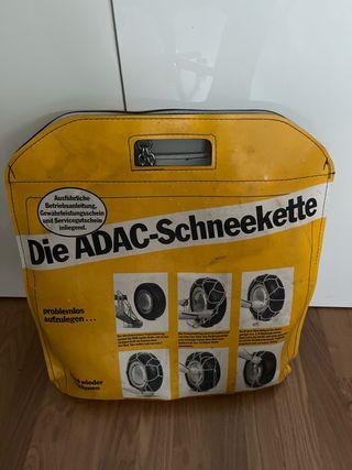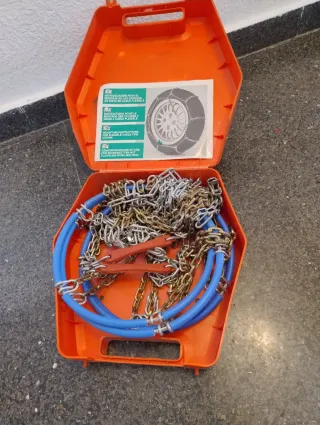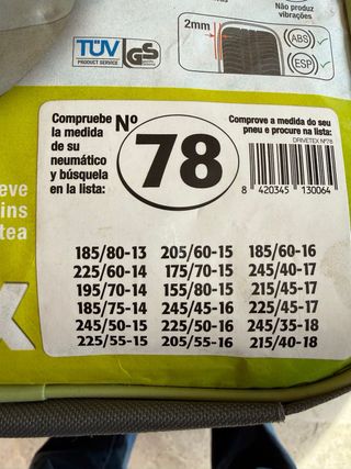 Cadenas para nieve para diferentes coches. Tengo 3, unas de tela. NEGOCIABLES - Incluyen caja o bolsa para almacenamiento. - Tallas compatibles indicadas en las etiquetas. - las naranja son JOE modelo E-9 - Incluye lista de medidas compatibles: 175x16, 180x15, 185x15, 195x14, 195/55x16, 195/70x15, 195/75x15, 205/55x16, 205/60x16, 205/65x15, 205/70x14, 215/55x16, 215/60x15, 225/50x16, 225/55x15, 225/60x14. - Certificación TÜV GS. - Diseño Rhombus.