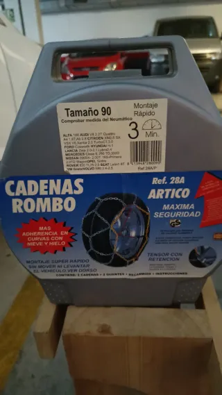 Cadenas para nieve Rombo de montaje rápido, ideales para condiciones invernales. - Montaje súper rápido sin desplazar el vehículo. - Excelente adherencia en curvas con nieve y hielo. - Gran calidad, cementado y termocincado. - Eslabón de sección cuadrada para un agarre más seguro. - Incluye juego de cadenas, recambios de eslabones, par de guantes e instrucciones de montaje. - Compatibles con medidas de neumático: 145x15, 155x14, 165x13, 155/70x15, 165/50x15, 155/65x15, 165/70x14, 175/55x15, 175/65x14, 175/70x13, 185/50x15, 185/55x14, 185/80x14, 185/65x13, 195/50x14, 195/55x14, 195/60x13.