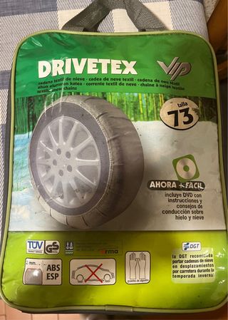 Cadenas textiles DRIVETEX para nieve, talla 73. Incluyen DVD con instrucciones. - Talla: 73 - Incluye DVD con consejos de conducción. - Compatibles con ABS y ESP. - Guantes de algodón incluidos.