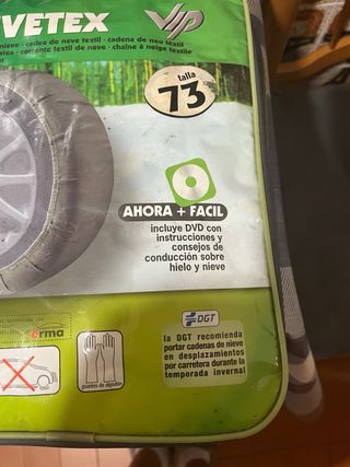 Cadenas textiles para la nieve de la marca Drivetex, modelo VIP. - Talla 77. - Incluye DVD con instrucciones y consejos de conducción. - Certificado TUV GS y DNV. - Compatible con ABS y ESP. - Incluye guantes de algodón.