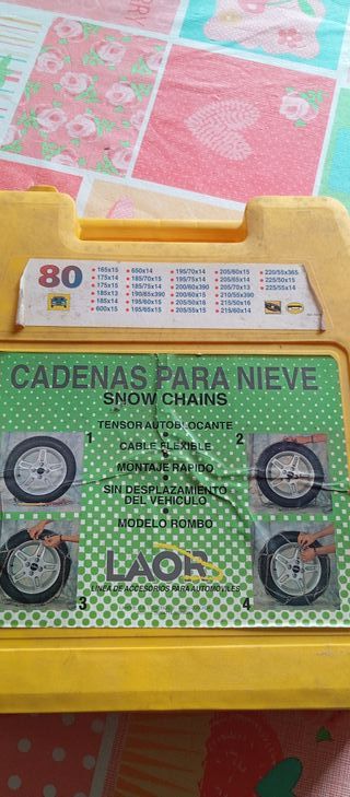Cadenas para nieve LAOR, modelo 80. Están nuevas y nunca han sido utilizadas. - Tensor autoblocante. - Cable flexible. - Montaje rápido. - Sin desplazamiento del vehículo. - Modelo Rombo.