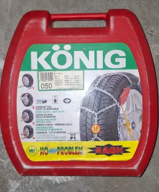Cadenas para la nieve de la marca König, modelo Super Magic. Sin estrenar, nuevas. La caja está algo rozada por el maletero aunque nunca se han usado. - Talla 102. - Compatibles con neumáticos 13”, 14” y 15” - Sistema de montaje y desmontaje automático. - Incluye caja de almacenamiento. - Fabricadas en Italia.