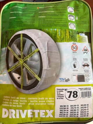 Cadenas textiles para la nieve de la marca DRIVETEX, talla 78. Son una alternativa ligera y fácil de montar a las cadenas metálicas tradicionales. - Montaje rápido en 3 pasos. - Incluye guantes. - No producen vibraciones. - Grosor de 2mm. - Certificación TUV GS. - Compatibles con ABS y ESP.