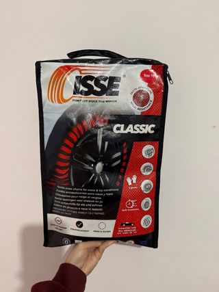 Cadenas textiles ISSE Classic para condiciones de nieve y hielo. - Talla 70. - Estructura textil de alta resistencia. - Incluye guantes y bolsa para guardarlas. - Instalación rápida. - Compatibles con todos los vehículos. - Producto patentado. - Fabricado en Europa.