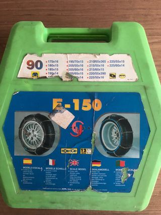 Cadenas para la nieve marca F-150, modelo 90. Incluye instrucciones en varios idiomas. - Para medidas de neumático: 175x16, 180x15, 185x15, 195x14, 195/70x15, 205/55x16, 205/60x16, 205/65x15, 200x14, 210/65x365, 215/55x16, 215/60x15, 220/55x390, 225/55x15, 225/60x14, 225/50x16. - Cable flexible y montaje rápido. - Tenseur autoblocante.