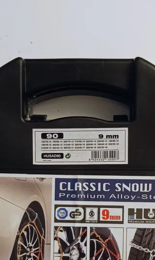 Cadenas para nieve Snovit E-9, modelo NEO, de 9mm de grosor. - Compatibles con medidas de neumático: 225/60x17, 225/65x16, 195/55x20, 235/35x20, 245/40x18, 215/55x18, 235/40x19, 245/45x18, 215/65x16, 235/45x18, 245/55x16, 225/35x20, 235/50x17, 255/40x18, 225/45x19, 235/60x16, 255/45x17, 225/50x18, 245/30x20, 265/40x17, 225/55x17, 245/35x19, 275/30x19. - Peso neto: 3,51 KGS. - Peso bruto: 3,90 KGS. - Homologación TÜV y GS.