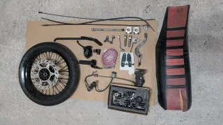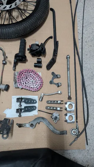 Conjunto de piezas para Rieju RR/RJ. - Rueda delantera con disco de freno y slick 150€. - Cadena voca reforzada no tiene uso. 10€ - Piña de luces. 20€ - Gas corto más puños 10 -Funda embrague 5€ -Contador de km 5€ - Pata de cambio. 5€ - Estriberas delanteras y traseras. 20€ - Freno delantero y trasero completo con pastillas. 100€ - Caja de tornillería y pequeños componentes. 🟥MAS PIEZAS EN OTRO ANUNCIO CON FOTO🟥