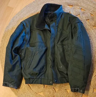 Chaqueta de moto Dainese de los años 90 en magnífico estado. Mangas extraibles ,forro interior, banda reflectante en el cuello. Atención sin protección en hombros ni codos!!! Talla 52 Chaqueta Dainese de color verde oscuro. Diseño moderno con detalles en relieve. - Cierre de cremallera. - Cuello alto. - Bolsillos frontales con solapa. - Puños y cintura elásticos.