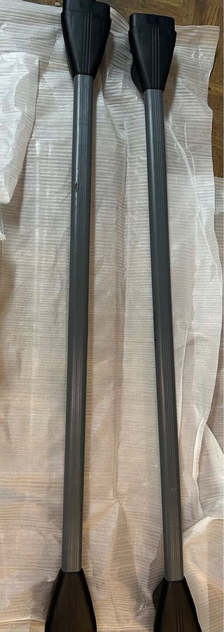 Juego de dos barras de techo universales, diseñadas para vehículos con techo tipo Golf. Son fáciles de instalar y transportar. - Material: Aluminio y plástico. - Color: Gris y negro. - Longitud: 130 cm aprox.