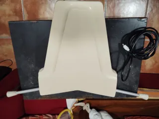 Antena de caravana MOK en buen estado. Se incluye la antena y su cable. - Antena de color beige claro. - Dispone de dos brazos laterales. - Incluye cable de conexión. Ideal para caravana o autocaravana. Sin mástil. diseñada para caravanas, con un acabado en color crema y detalles en azul.