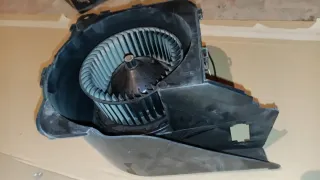 Ventilador para el habitáculo de un Ford Mondeo 1.9 TD. Año 1995 Pieza de plástico negro. La carcasa está un poco rota. - Incluye motor y carcasa. - Cables de conexión visibles.