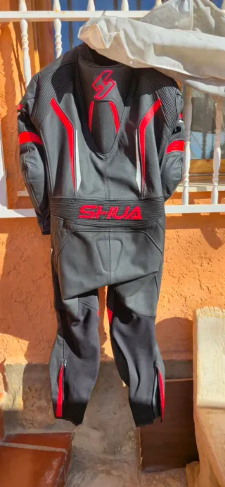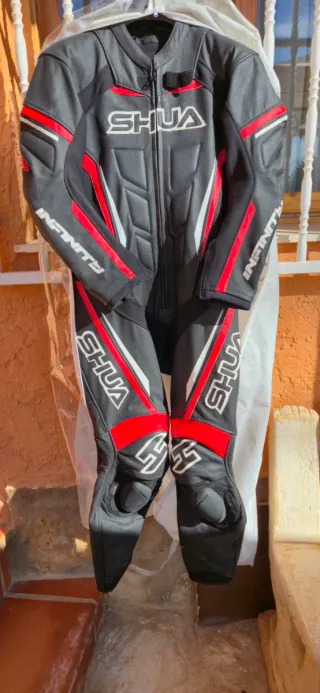 Mono de moto Shua Infinity para hombre, diseñado para ofrecer protección y estilo en la carretera. - Color negro con detalles en rojo y blanco. - Marca Shua. - Modelo Infinity.