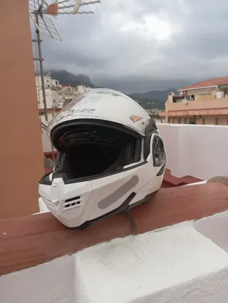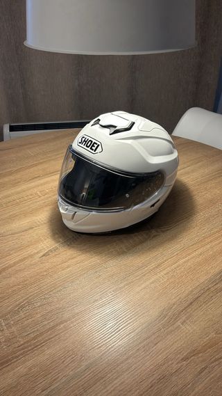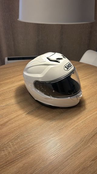 Casco de moto Shoei en color blanco, prácticamente nuevo. Solo se ha usado en 8 ocasiones. - Diseño aerodinámico. - Visera clara. - Cierre de seguridad.