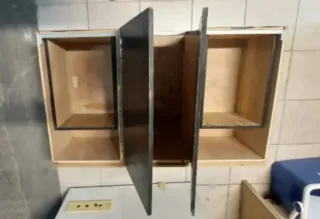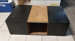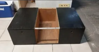 Mueble de madera con acabado en negro, diseñado para camperizar vehículos. - Estructura robusta. - Compartimento central se abre y se cierra. - Dos compartimentos grandes laterales. MEDIDAS: - fondo 70cm - de alto 37cm - de ancho 119cm