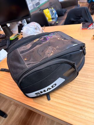 Mochila para depósito de moto de la marca Shad, modelo SL 20. Cuenta con una ventana transparente superior. Se incluye forro para depósito con imanes y funda de agua. Solo usada en un viaje. Completamente nueva. - Color negro. - Material textil resistente. - Cierre con cremallera....