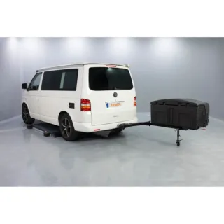 Caja de remolque Towbox V3 para camper. - Color negro. - Diseño robusto - Amplia capacidad de carga. -Permite el giro del baul aun teniendo porton -cierre de seguridad en la bola -Incluye una cámara de aparcamiento trasero para ver desde el movil