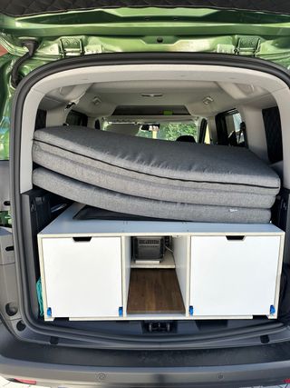 Kit camper en muy buen estado. La madera es impermeable. Para furgonetas de talla M: toyota proace city, peugeot rifter, etc. Medidas del kit en el maletero: 40 cm de alto 73 cm profundo 117 cm ancho Cama extendida: 115 x 185
