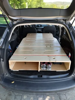 Módulo camper hecho a medida para Renault Megane 2 familiar. Ideal para viajes y escapadas. Cabe un colchón de 1,80 de largo x 1,10 de ancho Incluye un cajón para almacenar todo tipo de artilugios para tus viajes. En el mío guardo, menaje, sartenes y ollas, saco de dormir, camping gas, mesa de camping, y silla plegable - Construcción en madera muy robusta. -Gran capacidad de carga -Asientos traseros funcionales Una vez desplegado el módulo, contamos con una estructura de cama muy recta y firme, que nos permite poner un colchón plegable de hasta 1,80. Lo puedes desmontar y guardar en otro sito Preguntar por videos Camper Megane