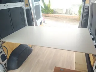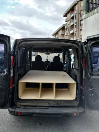 Mueble de madera para camperizar tu furgoneta Renault Traffic. Ideal para crear un espacio de almacenamiento y cama. - Fabricado en madera por carpintero. - Diseño a medida para Renault Traffic. - Fácil montaje y desmontaje. - Venta en persona.