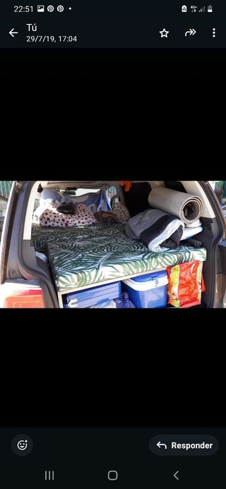 Vendo Cama hecha a medida para Volkswagen Touran. - Colchón desmontable, con funda lavable con cremalleras, de estampado tropical. - Base de madera con bisagas para facil desmontado. Construcción artesanal, se monta sobre los asientos traseros plegados. Añadiendo la estructura de madera en la parte del maletero y el colchón encima, con velcros para que se mantenga unido Se hizo siguiendo en video tutorial de youtube que sale en las ultimas fotos. - No se incluyen el resto de cosas que salen en la foto - A recoger en Valencia. Lo vendo por cambio de coche.