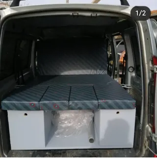 Mueble diseñado y construido por mi, colchonetas con espuma y viscolástico. Para un mejor descanso. Con 2 muebles, uno a cada lado para guardar accesorios. Ideal para furgonetas pequeñas tipo kangoo, se vende por no usar, mueble convertible. en cama y salon dentro de la furgoneta, como se puede apreciar en las fotos, también dispone de avances para hacer un salón para albergar una mesa y una cocina Y algunos accesorios más : conina , amaca colgante con misquitera Para poder utilizar en camping.