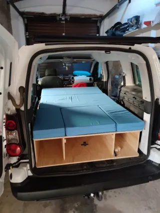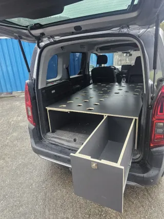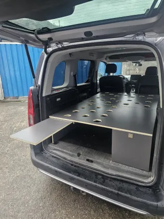Mueble cama diseñado para convertir tu Berlingo o Partner en una camper.(de 2000 a 2007) - Fabricado en madera contrachapado. - Incluye compartimentos de almacenamiento. - Espacio para nevera, bidón de agua, mesa... -Incluye colchón y oscurecedores térmicos.