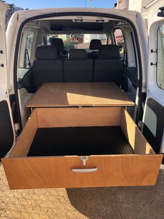 Mueble de madera para camperizar tu furgoneta, ideal para crear una cama y zona de cocina. - Fabricado en madera de contrachapado - Diseño funcional y ligero. - Cajón de 80 x 90 cm. - Guias reforzadas de 80 cm. - Espacio inferiror para guardar mesa exterior. - Montaje cama en segundos. - A medida para VW caddy, opel zafira y otros modelos. - Se vende sin colchon.