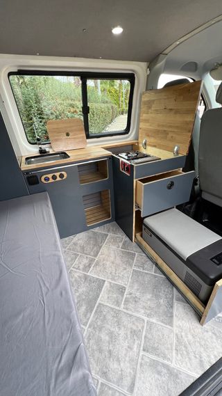 Mueble Camper fabricado en madera contrachapada de chopo de 1'8cm. El mueble no afecta a los asientos traseros y no necesita homologación. Mueble ideal por su practicidad y sencillez a la hora de transformarlo en cama. Haz de tus viajes en furgoneta auténticas aventuras.. compatible con furgonetas tamaño pequeño, Citroen Berlingo, Peugeot Rifter, Peugeot Partner, Toyota Proace City etc