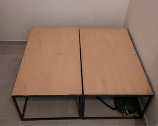 Base de cama o mueble camper, fabricado en madera y estructura metálica, muy ligero y resistente. Medida de cada mueble: 56,5cm ancho, 1m largo y 39,5cm alto. Medida del conjunto: 113cm ancho, 1m largo y 39,5cm alto. - Diseño modular. - Superficie de madera clara. - Base metálica negra