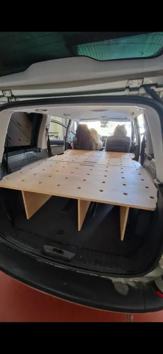 Plataforma de madera para cama de coche, diseñada para Peugeot 807 (pero compatible con Partner, Traffic, Rafter, y muchas más) para convertir tu vehículo en un espacio de cama doble. - Fabricada en madera contrachapada. - Diseño con soportes para mayor estabilidad. - Agujeros perforados en la superficie. Vendo el coche y el comprador no necesita la cama. La cama se entrega en Asturias o Madrid. Regalo los 6 cojines!