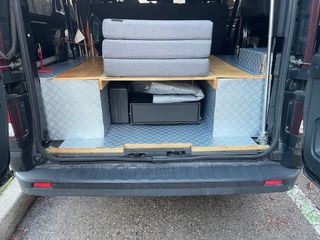 Mueble versátil para furgoneta camper, diseñado para funcionar como cama y mesa. - Construcción robusta con paneles de madera. - Espacio de almacenamiento integrado bajo la superficie. - Colchón plegable de tres piezas incluido. - Actualmente instalado en una Opel Vivaro. - Nada anclado. Perfecto para no tener que homologar. - La parte del mueble que pega a los asientos, se pliega para mayor versatilidad, ya que pueden ir montado tanto el mueble como los asientos traseros (en este caso no se podrá desplegar el mueble para conseguir el largo de la cama pero si se puede utilizar como mesa). - Mejor ver.