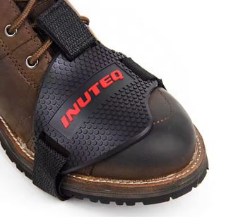 Protector para la palanca de cambios de moto. Ayuda a proteger el calzado durante los cambios de marcha. - Material de goma texturizada. - Correa ajustable de tela negra. - Se sujeta al pie con velcro.
