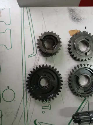 Conjunto de piñones y eje para la caja de cambios de una KTM 525. Incluye varias arandelas y clips....no es.completo Todo junto 100e...seperado 20e cada pinion 40e eje con pinion No tengo mas piezas de caja - Piñones de diferentes tamaños. - Eje principal con estrías.