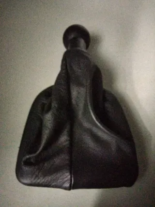 Pomo de cambio de marchas para Clio. Diseño deportivo con costuras. - Acabado en cuero sintético negro. - Anillo superior plateado. - Detalle de costuras en rojo y blanco. - Indicador de 6 velocidades y marcha atrás. Precio negociable