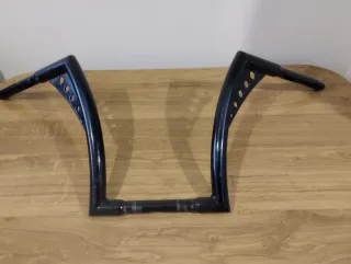 Manillar para moto estilo custom, acabado en negro brillante. - Diseño curvo y angular. - Detalle de agujeros en la base. - Fabricado en metal resistente.