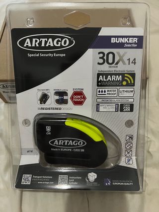 Sin estrenar. Candado con alarma anti- ganzúa. Resistente al agua. Diámetro 30x14, para poner en el disco de freno delantero o trasero.Viene con una funda para guardarlo y 3 llaves.