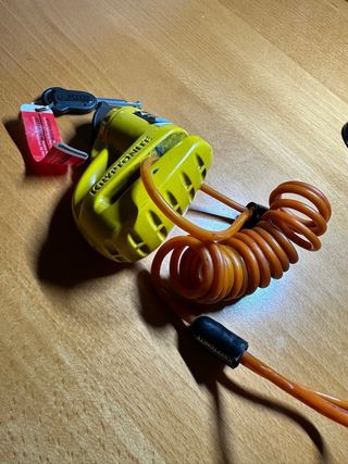 Candado antirrobo de titanio para moto. Marca Urban (10mm). Incluye un cable recordatorio de color llamativo para evitar olvidos. Vale para casi todos los modelos, yo lo utilizaba en mi Piaggio Liberty 125.