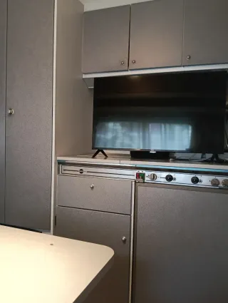 -2 ambientes, con salón convertible en cama de matrimonio y dos literas. Actualmente el salón está puesto como cama abatible con espacio para almacenamiento pero el material de origen está guardado y nuevo. -Cocina-fregadero inox 3 fuegos con tapa de vidrio (nunca se ha usado) y frigorífico compresor XL FREEZE 150L. - Ventanas con oscurecedores y mosquiteras, cuarto de baño con WC y plato de ducha. -Depósito de aguas limpias (50L). - Aire acondicionado Dometic -Toldo Fiamma Caravanstore XL -Avance liberty -Sobreavance inaca - Patas estabilizadoras -Portón lateral trasero y delantero