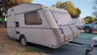 Caravana -750kg con documentación. Muy cuidada. Sin humedades ni filtraciones. Para 4 personas. Los sofás se convierten en dos camas, una de 135x200cm y la otra de 125x190cm. Oscurecedores. Cocina, nevera y baño. Funciona todo. La pared del baño se puede plegar para dar más amplitud a la caravana. Regalo avance de verano.