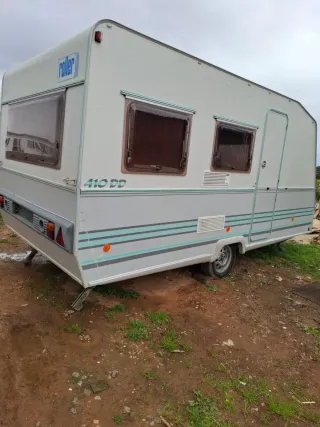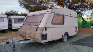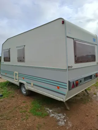 Caravana ligera con un peso de 750 kg. Perfecta tanto por fuera como por dentro. Tiene cocina,fregadero y nevera tanto a gas como a 220v. Dispone de radio con una bateria adicional. Se puede enchufar a la corriente y funcionan todas las luces y enchufes. Consta de dos ambientes que se pueden transformar en mesas y sofás. Gran capacidad de almacenamiento. No dispone de baño. Tiene papeles pero habría que pedir un duplicado ya que se perdieron. Ha estado guardada durante 10 años en una nave sin usarse ya que era de un conocido que dejó de utilizarla. Nada de humedades ni filtraciones. Perfecta para rutear,fincas,parcelas...