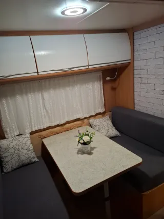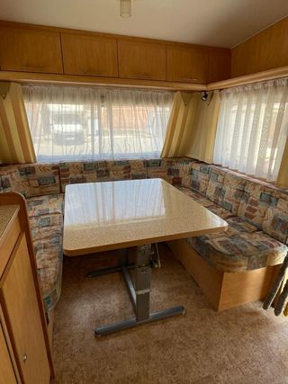 Caravana Burstner en buen estado. Amplio espacio interior, espacio para 6 personas, cama matrimonio, dos literas y la mesa de en medio convertible en cama de 1.10cm con colchón grueso. Aire acondicionado dentro de la caravana, lavabo recién reformado, avances y cocina con tres años. Se regala armario.