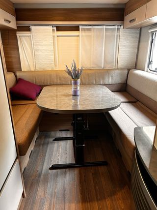 Cama fija de matrimonio con colchón visco nuevo. Salón comedor convertible en cama. 2 literas fijas. Baño completo con WC químico, lavabo y ducha. Termo agua caliente. Bidón de agua de 50L bajo el asiento del comedor. Cocina con pila y 3 fogones. Nevera trivalente. 🔥Calefacción Truma por conductos en todas las estancias. Ventanas en perfecto estado con oscurecedores y mosquiteras (dos mosquiteras para cambiar). Un estor en la cama.🔋Autonomía:Placas solares nuevas con batería e inversor para uso independiente. 🎁Extras: Neumaticos nuevos.Estabilizador Alko. Avance de invierno de regalo. Tenemos moveer electrico. Itv sin pasar.