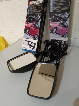 Set de espejos auxiliares para caravana, diseñados para mejorar la visibilidad al remolcar. - Incluye dos espejos. - Diseño universal para fácil instalación. - Ideales para caravanas y remolques.