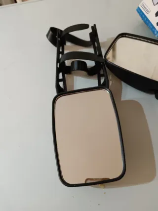Par de espejos retrovisores diseñados para caravanas o remolques. Permiten una mejor visibilidad al conducir. - Ajustables para una colocación personalizada. - Sistema de sujeción con correas. - Diseño universal para diversos vehículos.