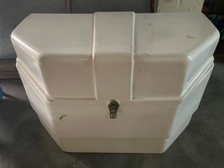 Baúl de fibra de vidrio (muy poco peso y resistente) blanco, ideal para caravana, remolque tienda o remolque. - Diseño octogonal. - Cierre metálico. - Medidas (muy grande): - altura 63 cm - parte trasera 105cm - lateral corto 38cm - lateral en diagonal 37cm - parte frontal corto 60cm - Superficie lisa.