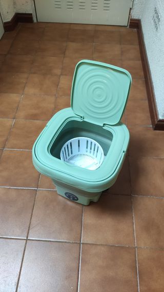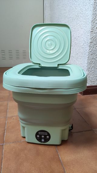 Lavadora plegable, ideal para llevar de camping o usar en caravanas. Es compacta y fácil de guardar. - Diseño plegable. - Color verde menta. - Panel de control con botones. Eléctrica