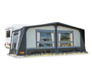 Avance de invierno para caravana Caravelair Antares Lux 445. Ideal para extender tu espacio de vida al aire libre. No sé las medidas, no lo he montado nunca y no sé la marca. Está en su funda completo. La foto no es del avance, puede no corresponder. - Fabricado en material resistente. - Diseño con ventanas. - Color gris y negro.